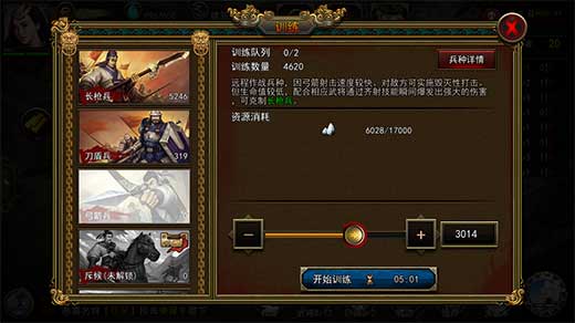 2、在城市中升级兵营,能够训练士兵,兵营等级越高,所能够训练的士兵类型越多。士兵是战斗的基本力量,武将出征带领的士兵数量越多,部队战斗力就越强。