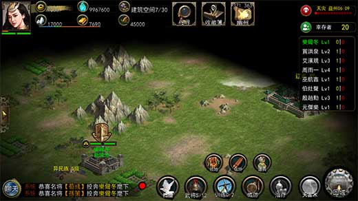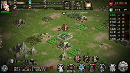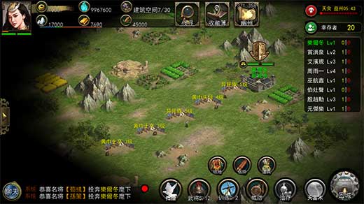 一、游戏开始以后,20座玩家的城市用孔明灯空投到400*400个格子的大地图上。玩家升级城市各种建筑,招募武将,训练士兵,探索地图,击败NPC,占领地图上的资源点收集资源,发展自身实力。