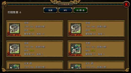 4、游戏大地图上有战争迷雾,升级城市中的瞭望台可以消除战争迷雾,瞭望台等级越高,消除战争迷雾后的可视范围越大。瞭望台还有个功能就是对大地图进行扫描。因为游戏的地图很大,即使消除了战争迷雾,玩家要自己手动在地图上寻找目标也是件困难的事情。使用瞭望台的扫描功能,就可以通过查看扫描结果,轻松的在地图上找到其他玩家的城市,以及NPC,及州、郡、县等城市,并能查看详细信息。但是使用瞭望台扫描需要消耗大量粮食。并且扫描一次以后需要一定的时间冷却,才能再次使用扫描功能。