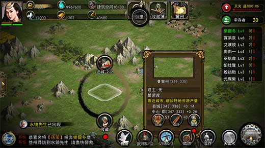 一局游戏进行到一定时间后,随机一个未发生天灾的州城上会出现水镜先生,玩家攻打该州城并获胜后,能获得水镜先生,玩家获得水镜先生时,如果已经修建了祭台,那么普通祭台施放的天雷术在此时就会成为天雷术-极,有概率直接摧毁目标城市一格耐久。但玩家在获得超级天雷术及准备和发动超级天雷术时,游戏中的大喇叭会进行播报,并暴露该玩家城市坐标,有可能成为其他玩家优先攻打的目标。