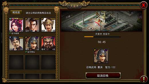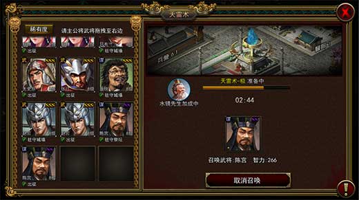 3、天雷术:在城市中升级祭台后,派遣将领在祭台上召唤天雷术以后,就可以使用天雷术轰击目标城市的驻防部队,令其遭受损失。己方召唤天雷术将领的智力,祭台的等级与目标城市城防驻防将领的智力及城墙等级之间的对比能影响天雷术的命中率和威力。在攻击目标城市的时候,先使用天雷术对对方驻防部队进行攻击,然后再派遣部队进攻能够提升己方攻城战的战胜几率。天雷术也需要冷却时间,并且会消耗大量铜币。因此选择适当的时机和目标使用天雷术非常重要。在游戏进行到一定的时间后,水镜先生会随机出现在某个州城,玩家攻打州城,获得水镜先生后,天雷术会成为天雷术-极,有概率直接摧毁目标城市一格耐久。