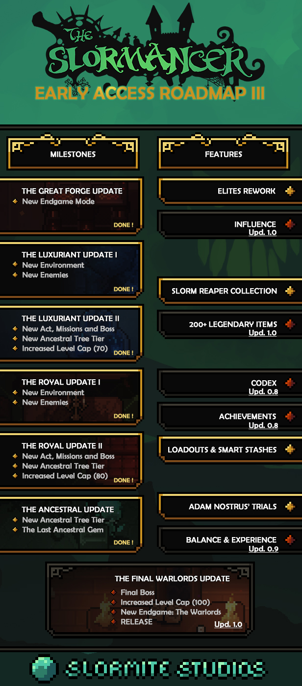The Slormancer is an epic 2D Action-RPG Dungeon Crawling game following a band of outcasts on their fight against hordes of enemies led by The Slormancer! Play as a "Mighty" Knight, a "Fierce" Huntress or a "Mischievous" Mage, master hundreds of abilities and ancestral powers, gear up, fight for the reputation of your kind and prove your value to the realm.