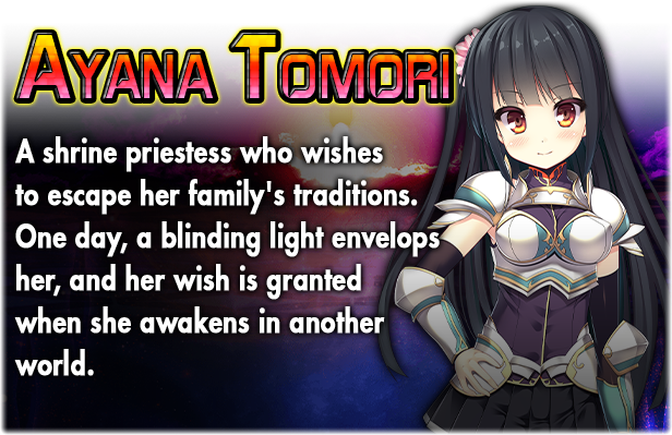 Ayana Tomori is a priestess who's next in line to inherit her family's shrine. She's a beautiful, intelligent, talented (and most of all, very modest!) young woman. She yearns for something more from life and wishes to escape the dull reality she faces every day. On a fateful, rainy night, the sound of lightning wakes her from her slumber. She's suddenly enveloped by a blinding light which, to her surprise, summons her into another world.