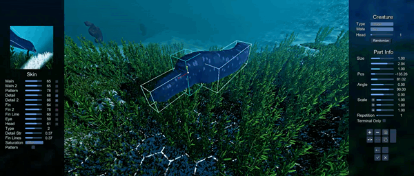 If you want to take a more hands-on approach in your creatures’ evolution, a suite of tools are provided, unlocked as you progress through the game, to force certain traits in your species. From high level settings such as requiring a species to have tentacles, be a certain size, or have a set amount of body parts, to minute details such as determining the amount of drag or torque a creature may face when swimming, the simulation is yours to control.