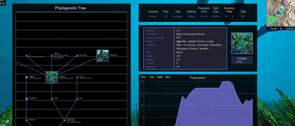 Each creature has a range of combat statistics that will determine their role in the food chain. As a species evolves and gains a foothold, it will need to adapt to survive attacks from predators or face extinction.