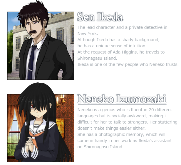 Sen Ikeda, a detective in New York, receives a mysterious invitation to Shironagasu Island in the testament of a millionaire. Together with Neneko Izumozaki, a girl with special abilities, he travels to the secluded island. Solve numerous mysteries and murders! Meet enigmatic and captivating characters! Discover the hidden secret of Shironagasu Island! Stay alive and escape from the ominous island!