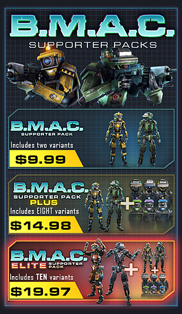 Rep your support for NS2 Development with the purchase of the B.M.A.C. Supporter Packs! Purchase of this pack will get you the most unique cosmetic to date with two entirely new player models for marines players to choose from, with up to 10 different color variants, two of which being very special extra emissive "Elite"...