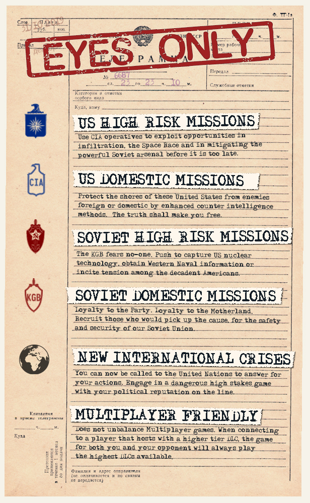 Throughout the game, certain unique opportunities will arise for dangerous espionage missions. These have powerful and unique effects in the game, such as being able to take enemy submarines out of service and catching up in the nuclear arms race. You only have one shot to pull these off and the consequences for failure can be devastating, so plan carefully!