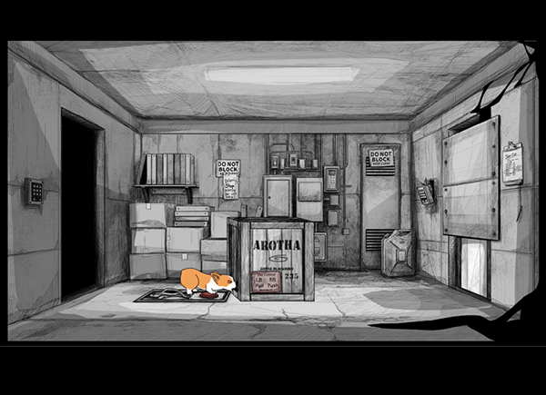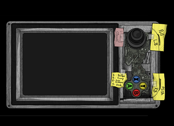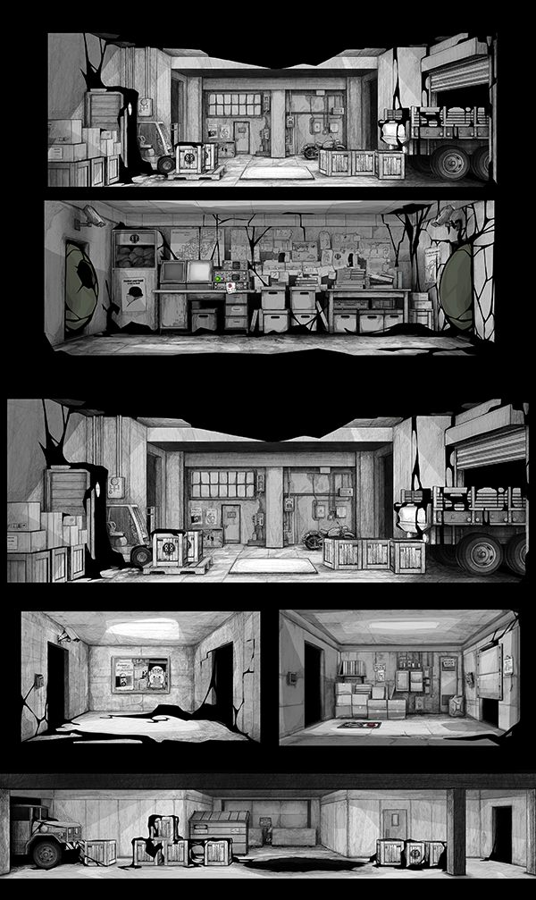 By using the contrast of black and white backgrounds, it gives me the chance to direct the players eye with either light or a small bit of color. This could be a button, highlight to show a hole or switch.