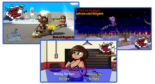 Powerslide around crazy tracks from ghost houses, speedways and even some of your favorite lewd games. Pick up as many dating items as you can and present them to the 'Pitgirls'.