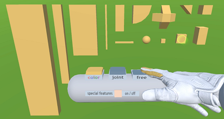 Grasp the part by pressing the button on the control, immobilize it completely and carefully place the second part into it. Finally, release both buttons and you so to create the assembling. It is possible to move the connected parts by using another block or by open hand. Today computers can handle about one hundred and fifty these objects in the scene.