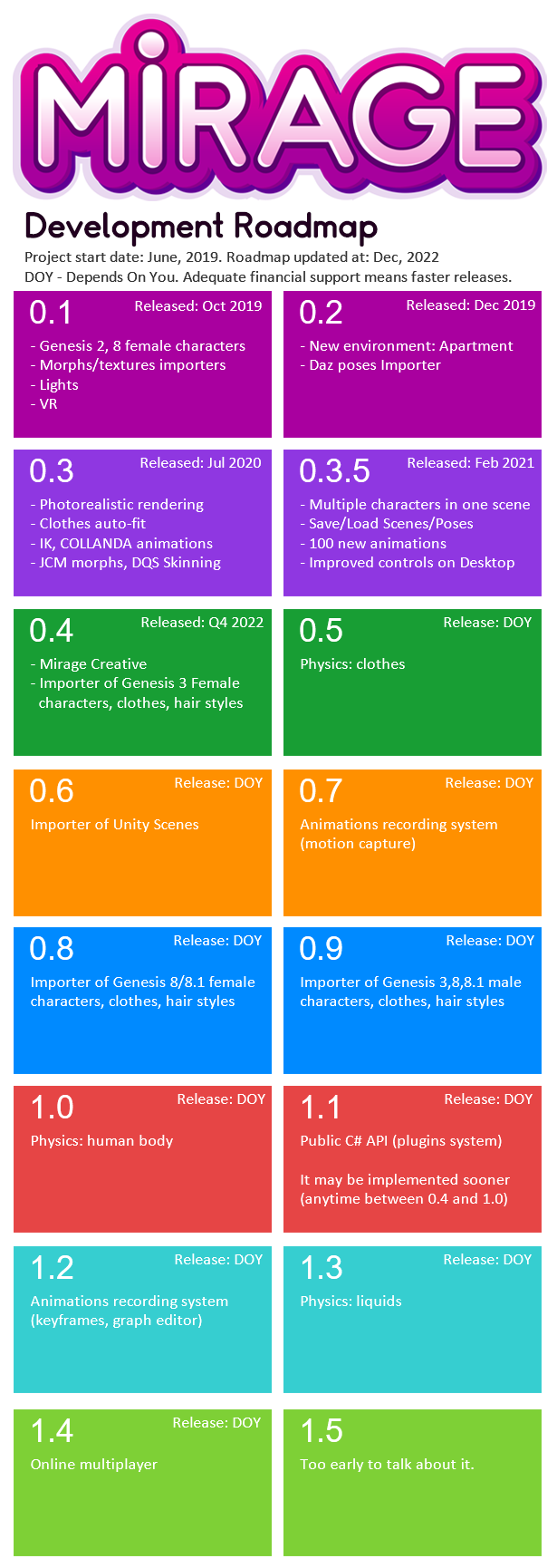MIRAGEMirage 0.3.5 is a complete project rewrite that uses latest Unity technologies (HDRP pipeline, DOTS, Post-processing effects), Genesis 3 characters, natural posing system, deep character customization, PC/VR support and more.