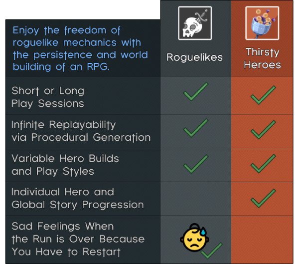 Thirsty Heroes is for fans of simulation games, dungeon crawlers, or deckbuilders who want to skip all the tedious parts and play at their own pace.