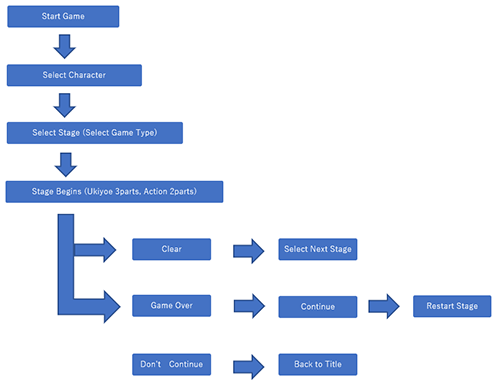 In a single stage, there will be 2 action parts in between the 3 Ukiyoe parts.