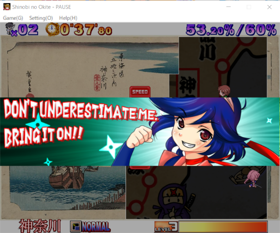The main feature of "Shinobi no Okite/The three female ninjas" is that it allows the player to enjoy both the Ukiyoe and the action packed part of the game. Upon selecting the stage, the Ukiyoe part will be shown first.