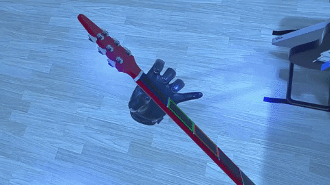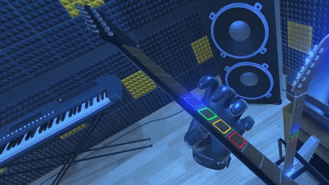 fingers can interact individually with the frets over the virtual guitar's fretboard while strumming with the plectrum on the other hand. Both left and right-handed guitar models are available.
