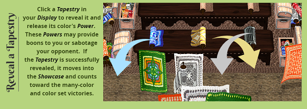Reveal a TapestryClick a Tapestry in your Display to reveal it and release its color's Power. These Powers may provide boons to you or sabotage your opponent. If the Tapestry is successfully revealed, it moves into the Showcase and counts toward the many-color and color set victories.