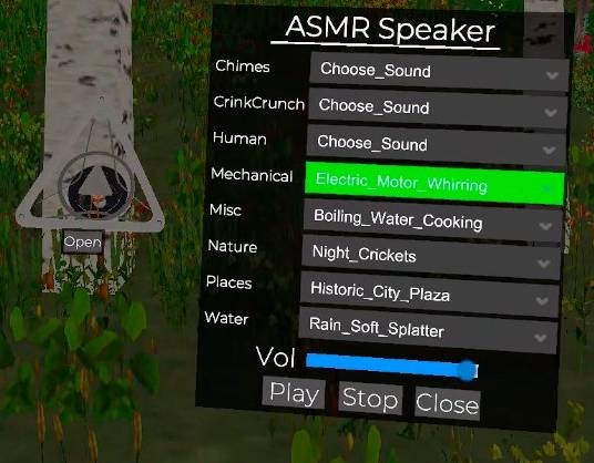 Spawn a speaker or many speakers and have a selection of over 100 ASMR loops playing around you anywhere you want!