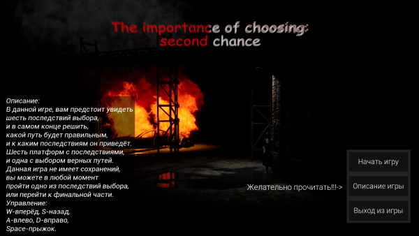 TIOC: second chance- a game which is designed for a peaceful passing, along with the main character you will face the consequences of a choice, which in the final will help you to make the right decisions, so you have the opportunity not to just take the consequences, and to explore the area and be aware of the challenges took place, the main character, and why she had to undergo these difficulties, you will be able to control your character, view a map of the main platform, and a flashlight that will illuminate your path. Each consequence is different from each other, the variety of terrain, its own history, its own end of history, and more. Consequences of refusing to study, trusting strangers, excessive faith in loved ones, the consequence of using prohibited substances. in the final part, you have the freedom of choice. The game has several endings, and it all depends on which path you choose.