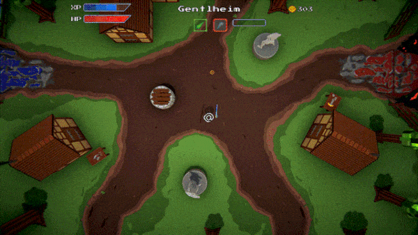 Gentlheim has shops to buy and sell goods; an Inn to heal up, level up, and stash gold to retrieve after death; and a deep Well leading to randomly generated procedural levels. There are various structures you can pay to upgrade and, as language returns to the village, townsfolk who may need something... Gentlheim hides a few surprises for the inquisitive gamer and provides a hub area to approach different stages in any order you like, or revisit levels you’ve already beaten.