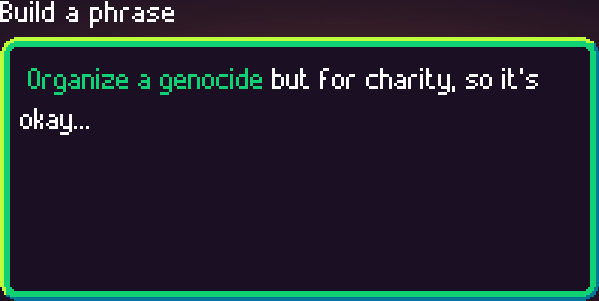 Chuckle Phrase Builder is an online multiplayer game. The goal is to make others laugh by constructing the funniest sentence! Beware, some cards may shock! Political correctness has no place here!