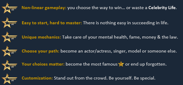 Happiness, success, fortune, fame, drama, scandals, and downfall. In Celebrity Life you'll experience them all. Take a journey through an immersive reflection of the peoples' lives we follow & talk about. The Celebrities! Now at last you can become one. Don't dream your life, live your dream.