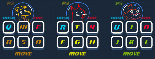 Players can play on keyboard as well, but beware of cramps! The keyboard controls are as follows: P1: Arrows-Keys to move, Period to Shoot, Comma to Dash. Additional players controls are depicted below.