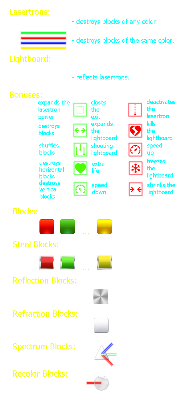 Arkanoid with optic styled physics and different bonuses. Lasertrons can be reflected, refracted, decompose into a spectrum of lasertrons, change their colors. Clean the playing field by lasertrons!