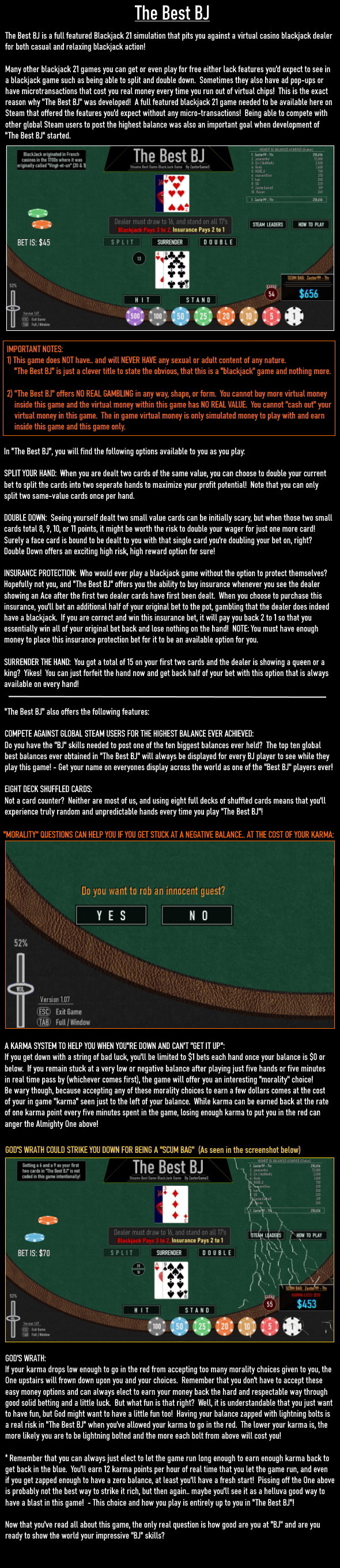 The Best BJ is a full featured Blackjack 21 simulator that pits you against a virtual casino Blackjack dealer! ..How good are you at "BJ" and are you ready to show off your impressive BJ skills? Whether you are a pro or looking to get better, "The Best BJ" is for you!