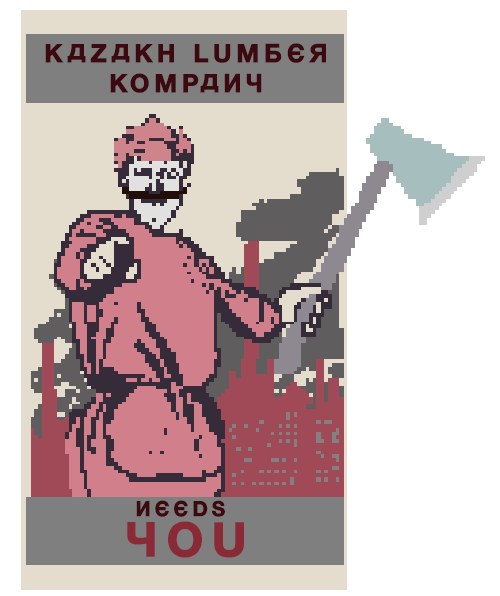 The year is 2025. When Forrest brashly accepts a month-long contract position with Kazakh Lumber Kompany after hearing an ad on his work radio, he didn’t expect to find himself stranded in a terrifying land full of danger and mystery. The recently-elected (now diseased) dictator Maksim Hubrisovich of the nation formerly known as Russia had led his nation into a swift nuclear defeat. Following the Great Nuclear War of 2022, Russia was effectively absorbed by Kazakhstan. A few years after declaring independence from the Soviet Union, Kazakhstan was once again a communist nation. The radioactive fallout from the war impacts daily life, but the economy must continue operating. Workers must move quickly to ensure their exposure to harmful radiation does not exceed levels determined by the Ministry of Health. Forrest must chop trees faster and more accurately than he ever has before. Does he have the ability to meet Kompany standards and simultaneously procure enough Kazakh Kredits in order to safely get back to his motherland? Escape the grip of the State!
