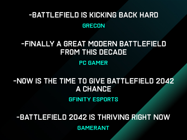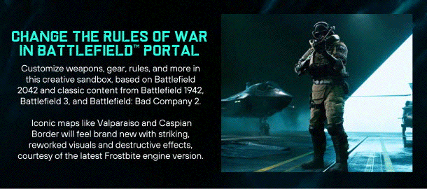 Lead your team to victory in both large, all-out warfare and close-quarters combat on maps from the world of 2042 and classic Battlefield titles. Find your playstyle in class-based gameplay and take on several experiences, including elevated versions of Conquest and Breakthrough. Explore Battlefield Portal, a platform where players can discover, create, and share unexpected battles from Battlefield's past and present.