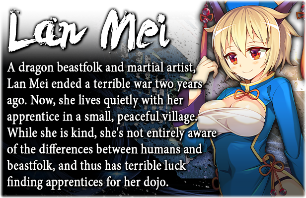 The beautiful dragon beastfolk, Lan Mei, was once known as the highest-ranking martial artist in the land who served the Emperor, and is the hero who ended the kung fu war two years ago. Afterwards, her master tasked her with starting a dojo and taking on an apprentice of her own.