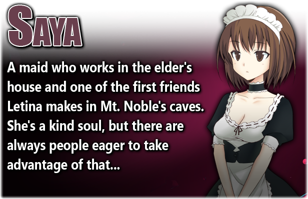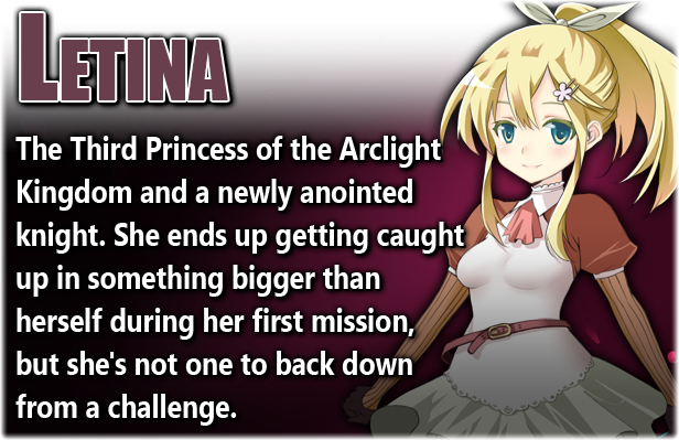 Letina is a trained knight of Arclight, but her lack of field experience makes her as green as most cadets. You'll explore the cave system within Mt. Noble, finding valuable treasure along the way and fighting the many creatures inhabiting each floor... or avoiding them entirely if you feel confident in your combat prowess! Grow stronger with the help of the spirits who dwell in the mountain, unlock shortcuts, find secret passageways, and uncover the mysteries of Mt. Noble's ancient corridors.
