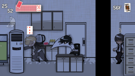 Three of Cards is a movie-like noir card action game.Use magic tricks to squeeze out employees who are chasing to stop the magician, and hack computers on the map to step up the floor of the company.
