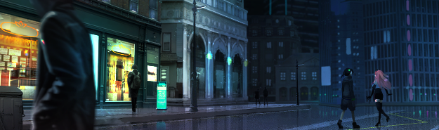 The background of the story is 5029 AD, "Guillotine", the Japanese territory on Mercury, a city full of neon signs and drunks.
