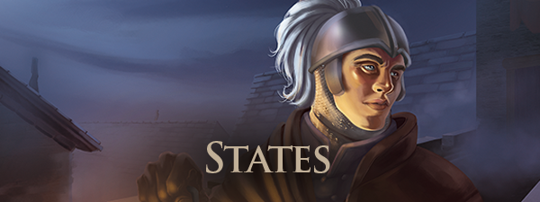 Three Hexes and one Kingdom card give players a State. A State goes in front of a Player and applies a Rule. Some states are kept, like Miserable. Some states are Returned, like Deluded, and one state, Lost in the Woods, stays until another player takes it.