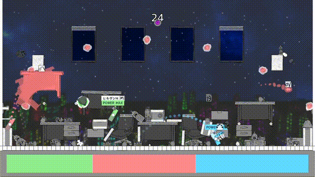 "Scatter Battlers" is a shooting battle game where cleaning robots pick up trash and non-trash objects and throw them at each other. The only controls are moving, jumping and shooting. Throw all sorts of things, from paper scraps, plastic trash, and empty cans to safes and office desks, and hit the target! The slapstick battle begins in the middle of the night when no one knows you're there!