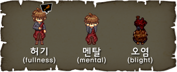 ‘Your Blight’ has three gauges that affect your survival. These are 'fullness', 'mental', and 'blight'. Players must find food, calm their minds, and purify Blight.