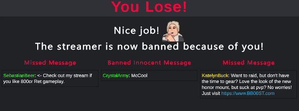 Each stream has different rules. For example, some streamers may not take kindly to links or self-promotion. Let the innocent messages through and ban any that violate the stream's rules. Failing to do so will result in a strike. Three strikes and you're out.