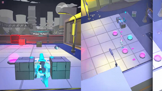 Two against the Legion is a short local couch co-op adventure puzzle game for two players, in which you have to defeat rebellious robots and prevent a technological disaster. The players have completely different game experiences.