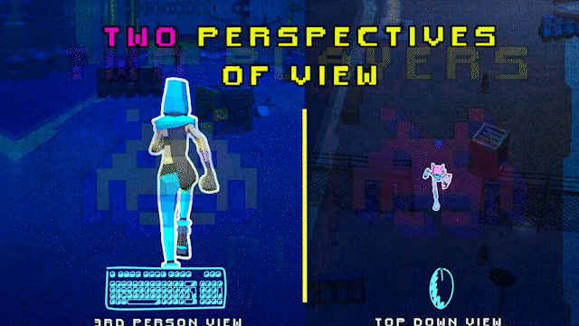 Player 2 controls his character with a mouse and sees the game from a top-down perspective.