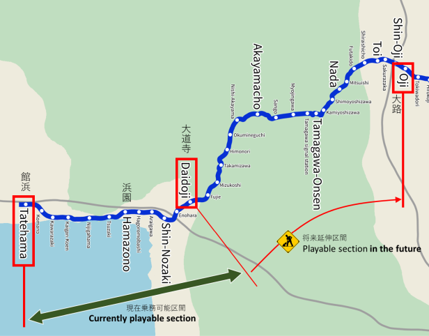 The Tatehama Electric Railway main line connects Otebashi Station to Tatehama Station. At present, the line can operate up and down 16.1 km of this line from Daidoji Station to Tatehama Station.
