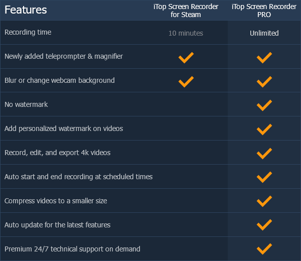 Unlike some other recorders, iTop Screen Recorder PRO doesn't limit how long you record. And you can record without a watermark if you want to save clean videos. To protect your videos from being stolen, it also allows you to customize your own watermark.