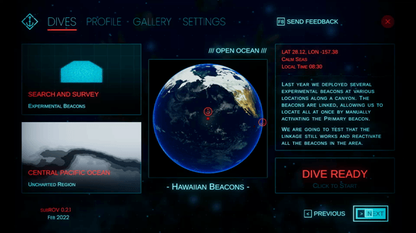 Take complete control of every dive as you navigate an oceanic Research Vessel to different dive sites. Deploy your ROV and use its tools and sensors to study the depths of the ocean and the creatures dwelling within it.