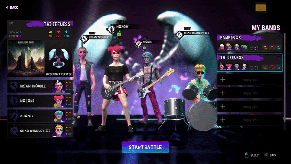 Dress up your band and make them your own! A large library of headgear and outfits to equip will make your band stand out during battle.