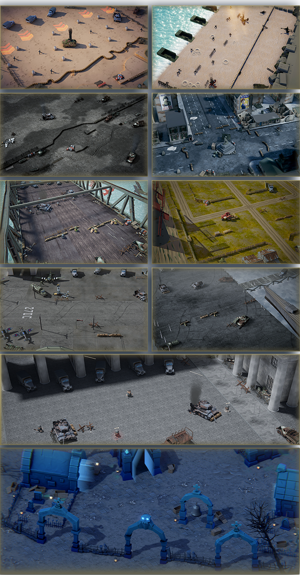 9 Different levels to battle on, one desert combat, with big obstacles like tanks and airplanes. Second one is on the beach, with bunkers that are supporting you. Third one is a big trench with 4 routes and charging bayonets. Fourth one is an city invasion with 4 routes and bombers! Also a big night map, to fight zombies!
