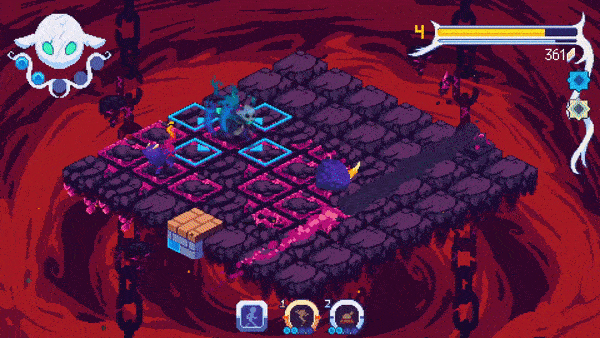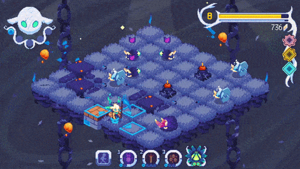 Moving strategically and attacking is vital. Close the gap with a Dash -- a mechanic that allows you to move twice the distance and ignore collision, allowing you to transverse an obstacle or gain a better position. Don’t forget Skills and Modifiers-- abilities and passive effects that can be equipped to create your build. Skills improve and carry over into successive runs, whereas Modifiers become stronger based on your Focus Level.