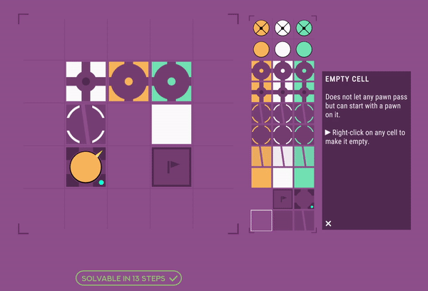 This game was made in a short period of time during lockdown by a passionate team made of two developers and a musician. We wanted to touch the essence of what makes a puzzle hard, try to tease players' brain with levels that encourage intentional problem solving and do all of that with a simple set of rules.