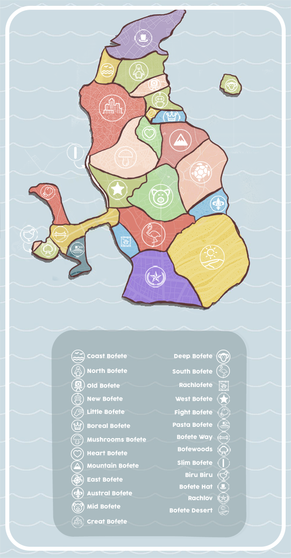 indescritible vibe although I am trying to describe. The Island is composed by various cities with Bofete names: Great Bofete, Little Bofete, West Bofete, Bofete way, Deep Bofete (You understood)... and also has Biru-Biru and Rachlov that are emancipated. This