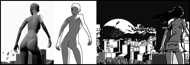 Switch between grayscale,black white outline and grayscale toon shading in the 3D scene